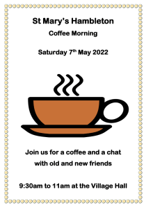 We have resumed our monthly coffee morning. Next Month it will be in Church and thereafter from July in the Village Hall on the first Saturday of the month.
