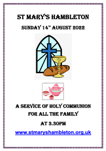 Notices Family Communion – 14th August 2022 at 3:30pm August 7, 2022 stmaryshambleton The Service to be led by the Revd Canon John Weetman