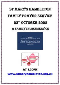 Notices Family Prayer Service – 23rd October 2022 at 3:30pm October 11, 2022 stmaryshambleton A short Family Prayer Service led by Revd Canon John Weetman Coffee and tea will be available after this service
