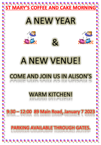 We are very grateful to Alison Garner for her kind and generous offer to host our January and February coffee mornings in her warm kitchen at 89 Main Road, Hambleton