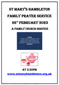Notices Family Prayer Service – 26th February 2023 at 3:30pm January 24, 2023 stmaryshambleton A short Family Prayer Service led by Revd Canon John Weetman Coffee and tea will be available after this service