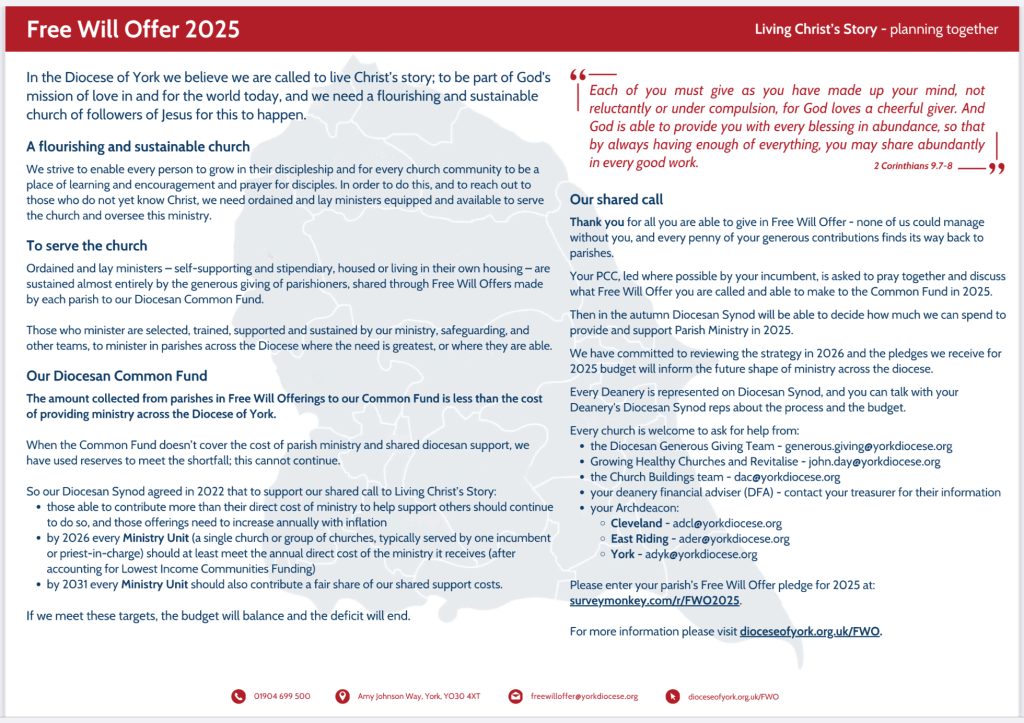 The the printable leaflet, ‘Free Will Offer 2025’, provides an overview of the plans we have made as a diocesan family under the banner of ‘Living Christ’s Story’, and of the financial realities facing us.